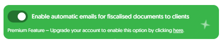 Scroll to find the option for "Enable automatic emails for fiscalised documents to clients", which has a toggle for you to switch on. Enable the option and then scroll down to save the customisation.
