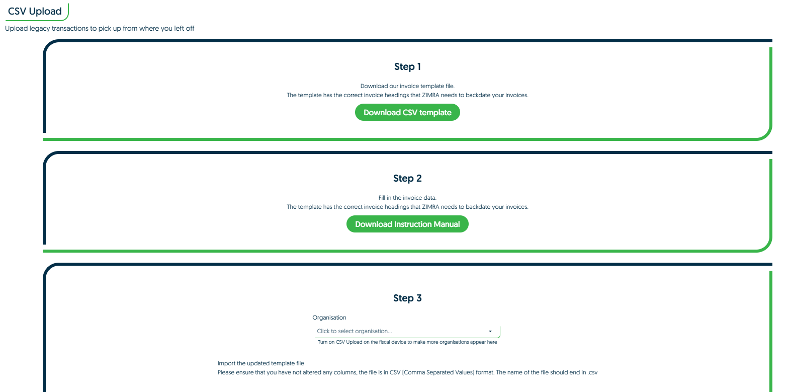 The CSV Import option allows someone to upload transactions from a period in the past before their integration was connected, where they were unable to create fiscal invoices while transitioning from their old fiscal supplier.