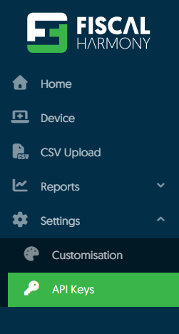 Overview Steps Step 1. Access and Set Up API Keys in Fiscal Harmony Log in to the client’s Fiscal Harmony account on https://app.fiscalharmony.co.zw/. Once logged in, navigate to Settings > API Keys to obtain your API Key and API Secret Key. Note ...