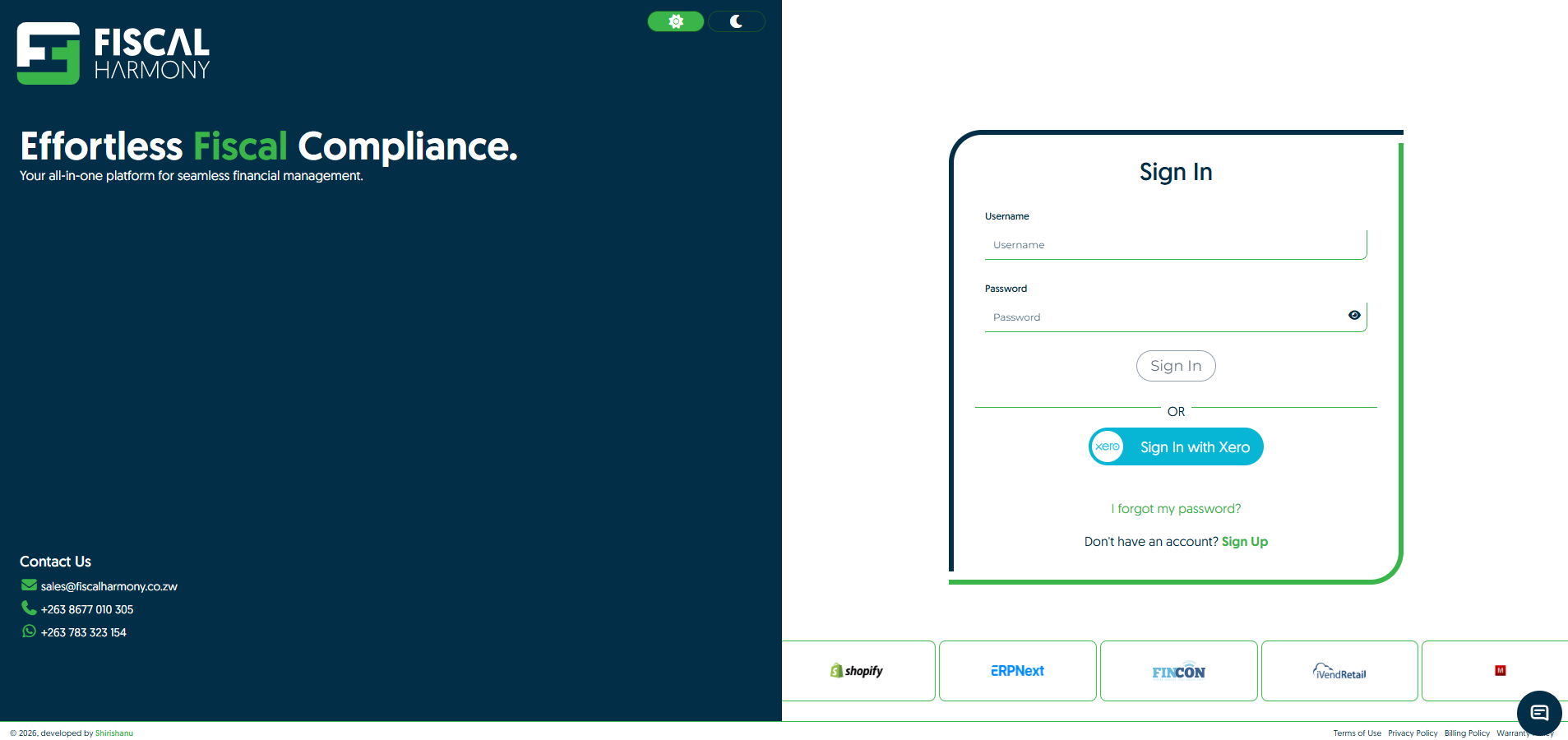 https://app.fiscalharmony.co.zw/login. Use your credentials to sign in. If you have forgotten your password, click 'Forgot Password' to reset it.