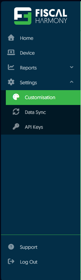 After logging in, from the sidebar (located on the left-hand side of the screen) you can navigate to Settings > Customisation.