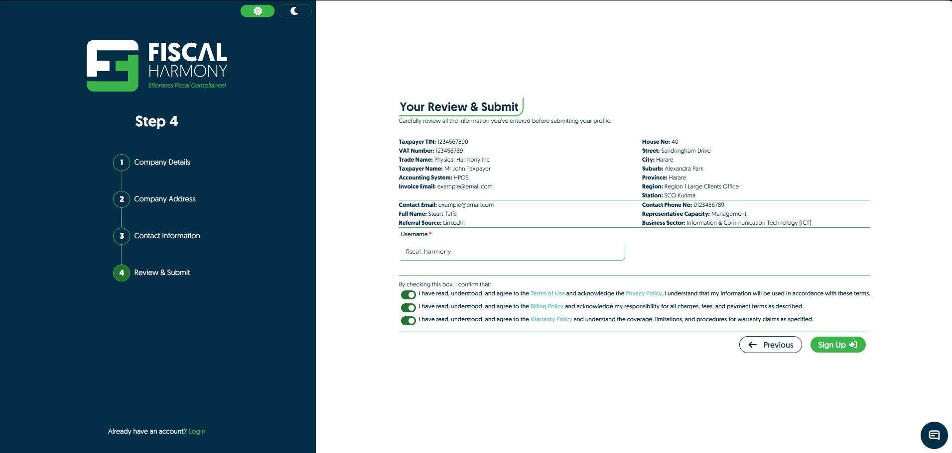 To start onboarding your company with Fiscal Harmony, follow the detailed steps below: