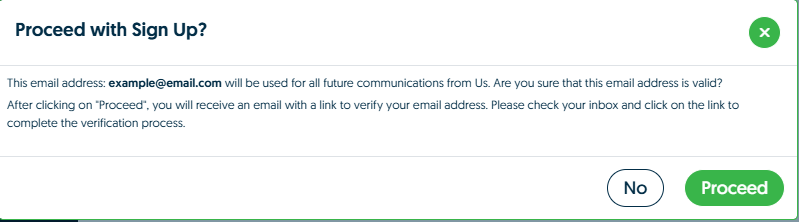 Once you have verified, you may click the Sign Up button on the form to complete the registration process. Note that a pop-up will show to notify you of the email address you will be able to receive communications from - this is the same email you provided in the contact part of the form.