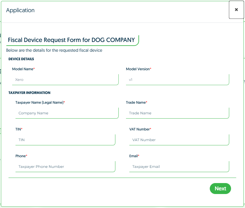 Make sure to add the company information and tax details needed for the device. You can always save a draft for you to complete later. - Once you are ready, click "Submit Application" for it to be sent to the Fiscal Harmony team to review.