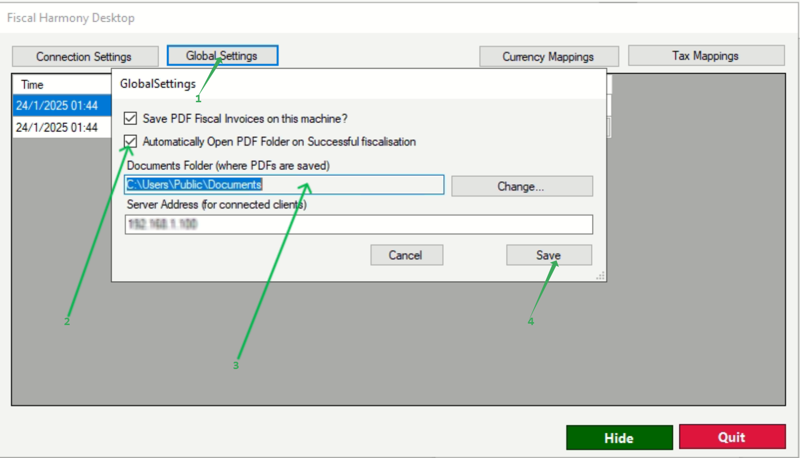 A page will popup and you check the checkbox with title "Automatically Open PDF Folder on Successful fiscalisation" if you want the folder with fiscalised invoices to open every time you run an invoice.