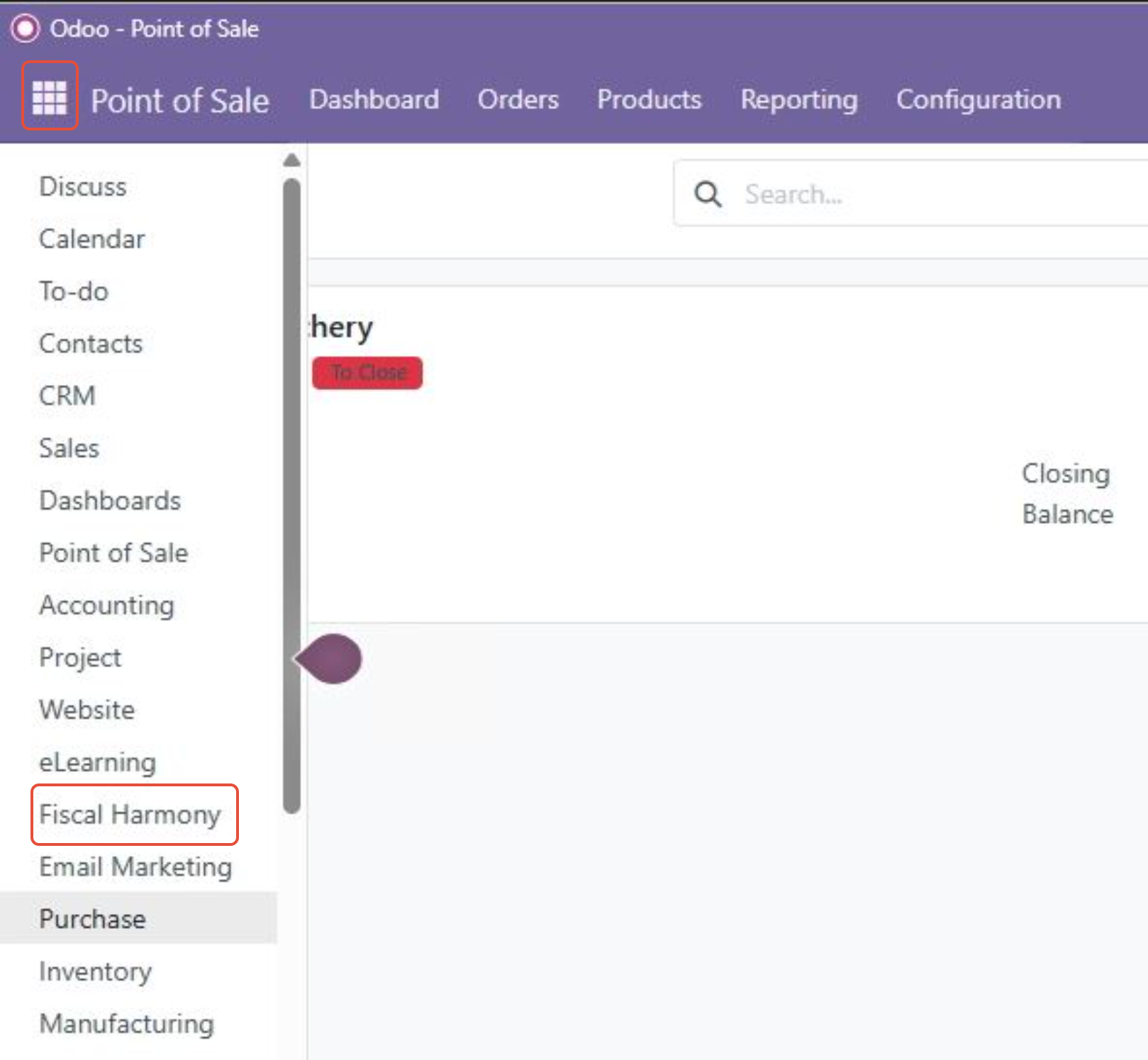 You will see a list of available apps/modules, scroll down and click FISCAL HARMONY